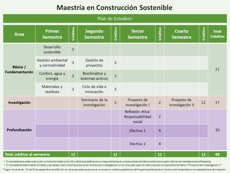 El programa de Maestría en Construcción Sostenible se proyecta como un espacio académico donde se problematiza, investiga, debate, propone y actúa sobre la correcta intervención del hábitat construido de manera interdisciplinaria, crítica y comprometida con el entorno natural, con la sociedad y con el desarrollo sostenible del país.